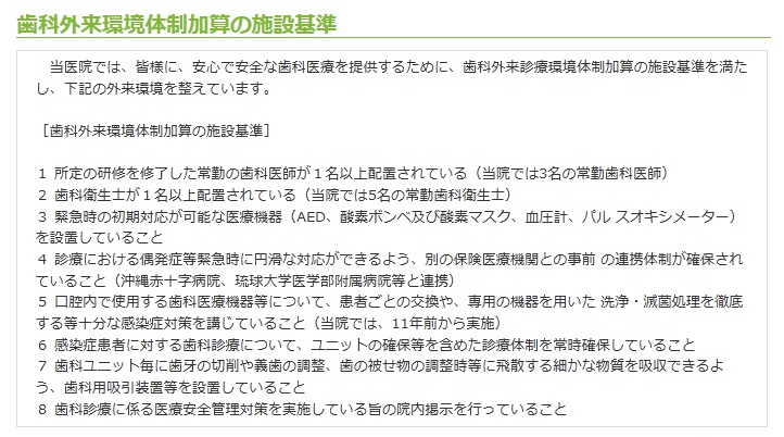 診療環境といたしましては、皆様に安心、安全な歯科医療を提供するために、厚生労働大臣が定める歯科外来診療環境体制加算の施設基準に適合しています。