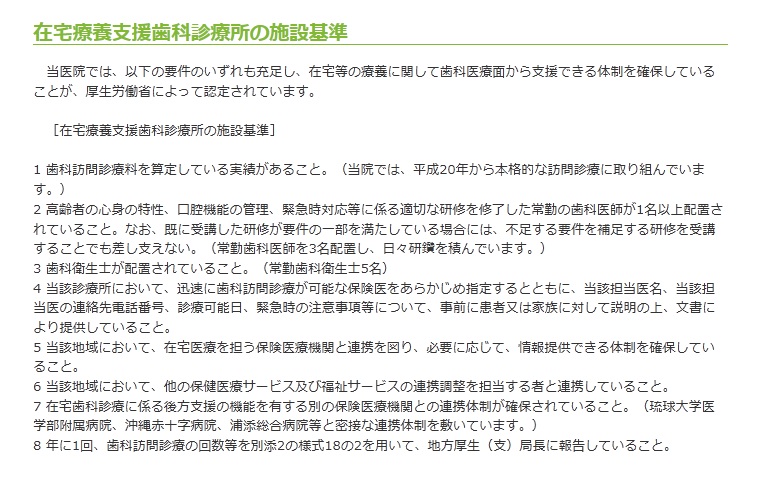 また、いろいろなご事情により、どうしても通院できない皆様のために、訪問診療にも力を入れています。往診関連設備、器材といたしましたは、ポータブルレントゲン装置、ポータブル切削装置、ポータブル吸引装置等を備えています。当医院は、訪問歯科診療につきまして、厚生労働省から在宅療養支援歯科診療所の認定を受けています。